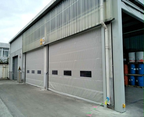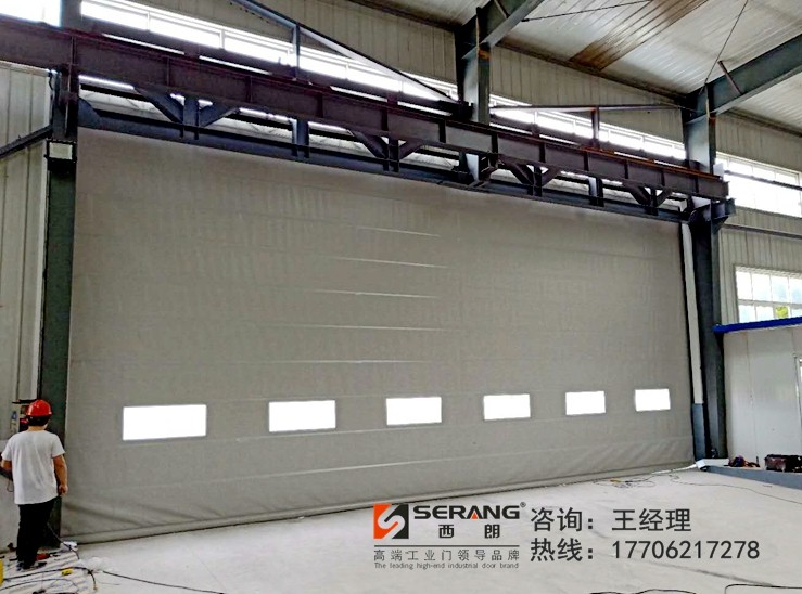 选用西朗灰色大型背带式快速门,具有快速启闭、防尘隔离、密封环保的功能。在门帘中部1.2-1.5米处配了采光视窗,内部背带式结构,超宽超大的快速卷帘门,满足户外抗风抗压要求,抗风等级10-12级,同时可以防雨防水。