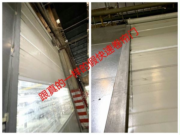 2、跟真的一样的假快速卷帘门:追求低价简配的厂商,甚至把快速卷帘门做成卷帘门的结构,只把金属门帘换成PVC门帘,不是行业内人士看上去就以为是快速卷帘门产品,实际安装使用后,根本实现不了快速、频繁、稳定运行的效果,也失去了工业快速门快速隔断、密闭防尘的功能。(见上图)